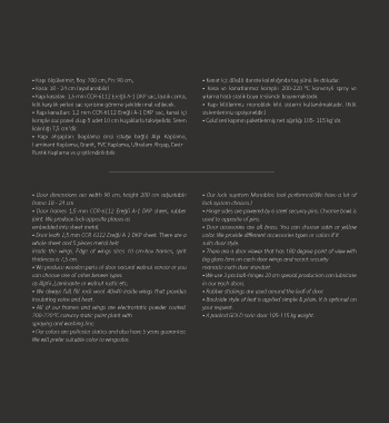 • Door frames 1,5 mm CCR-6112 Ereğli A-1 DKP sheet, rubber • Hinge sides are powered by 6 steel security pins. Chrome bowl is