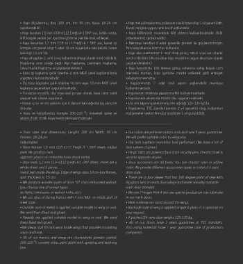 • Kapı kasaları 1,5 mm CCR-6112 Ereğli A-1 DKP sac, lastik conta, • Kapı kilitlerimiz monoblok kilit sistemi kullanılmaktadır. (Kilit